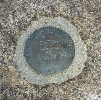 For the most part, misalignments don't represent real geologic changes, but occur because it's tricky to plop an aerial or orbital image onto the latitude and longitude grid. The image has to be aligned with reference points established on the ground. For this purpose, NGS maintains a network of fixed GPS stations and, over the past two centuries, has sprinkled the land with survey marks—typically, metallic disks mounted on exposed bedrock, concrete piers, and other fixed structures. The photo at left shows one near my house. But the process of ground-truthing a map is never perfect. Moreover, the survey-mark coordinates can be imprecise or downright wrong.